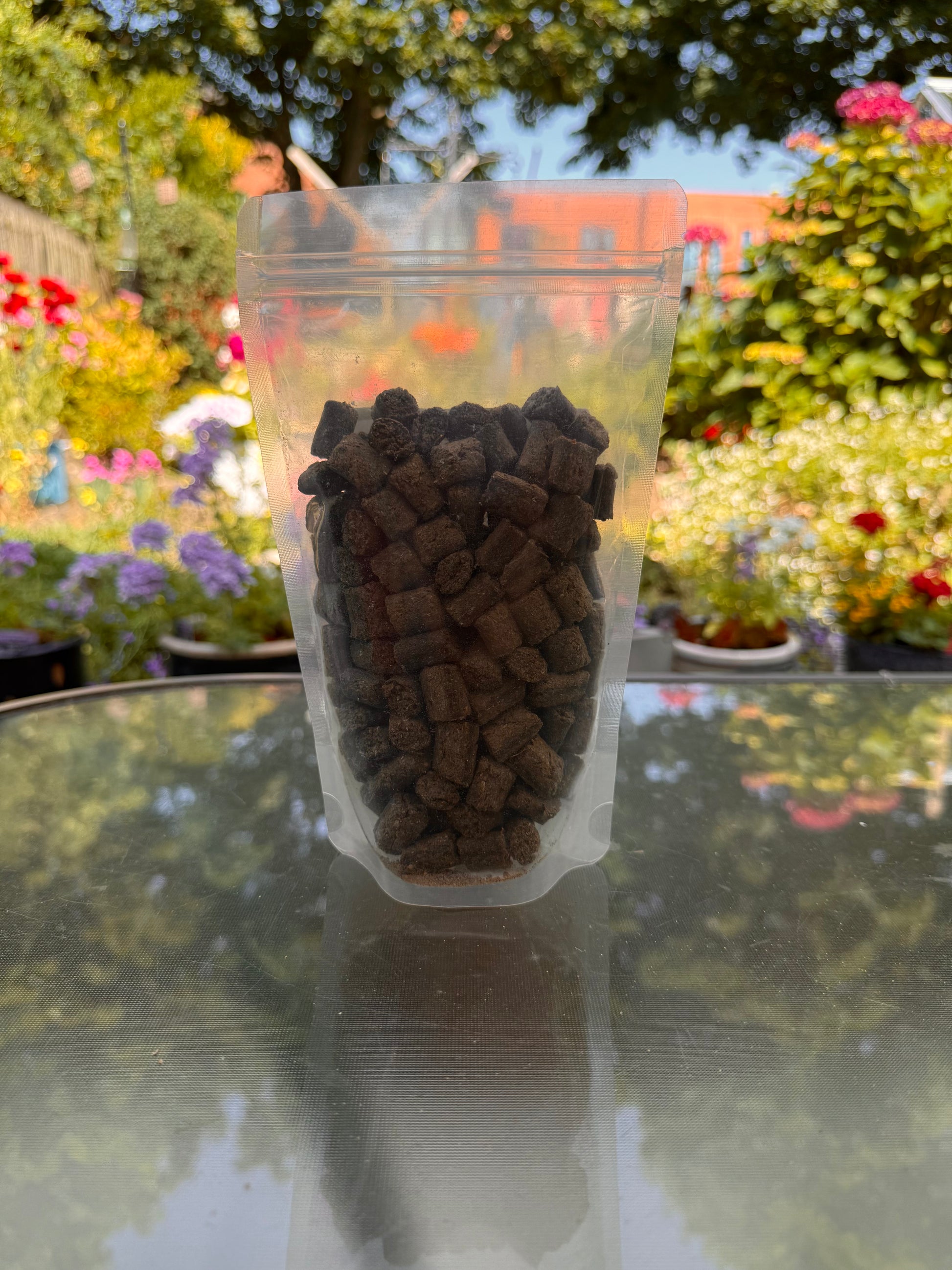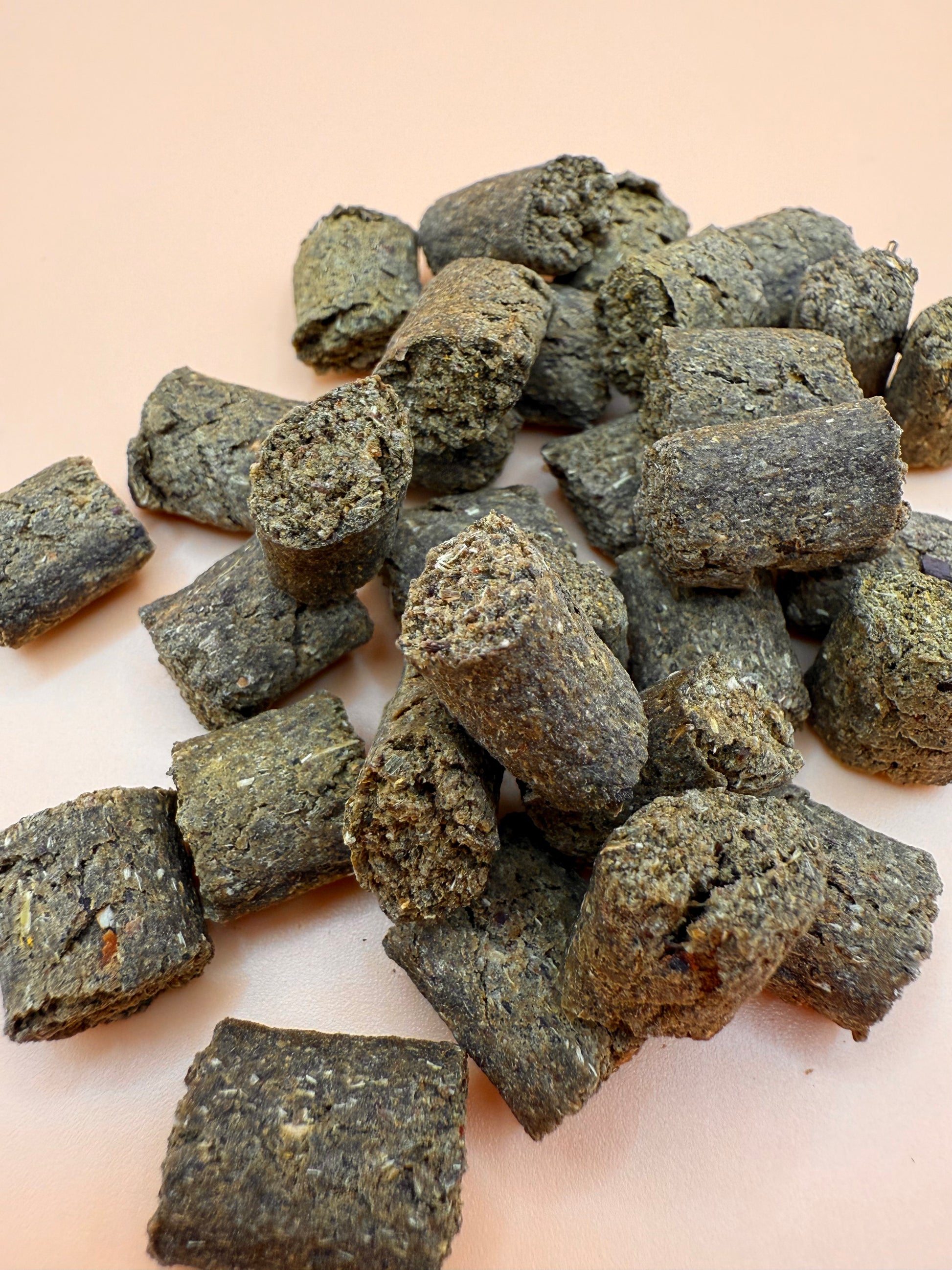 Our crunchy dog treats are a complimentary feed for dogs alongside a balanced diet and unlimited water. Feed our treats as a reward during training and feed sparingly alongside a complete food. Although our treats are allergy friendly, always consult a vet before feeding you dog new products if they have allergies.